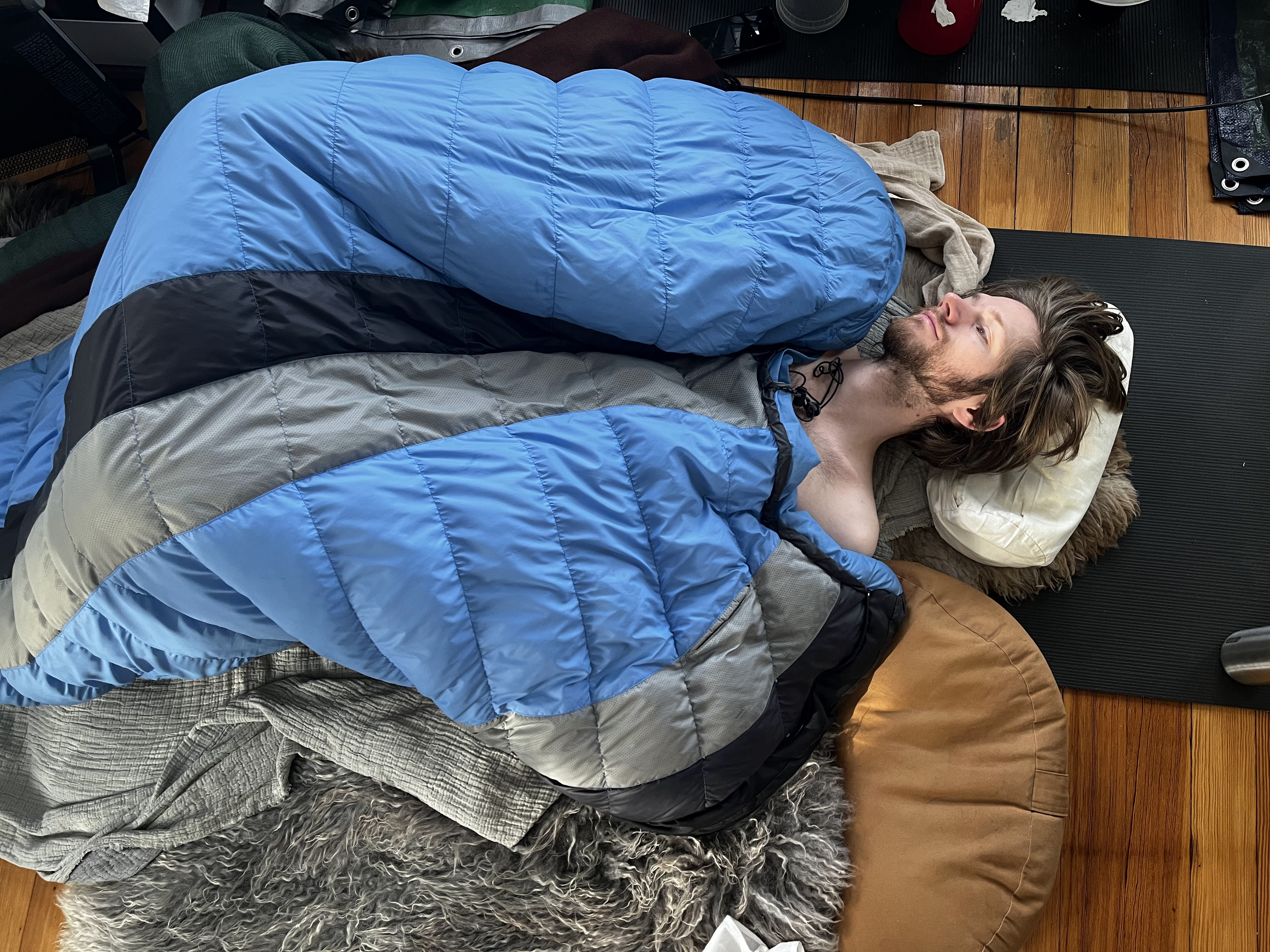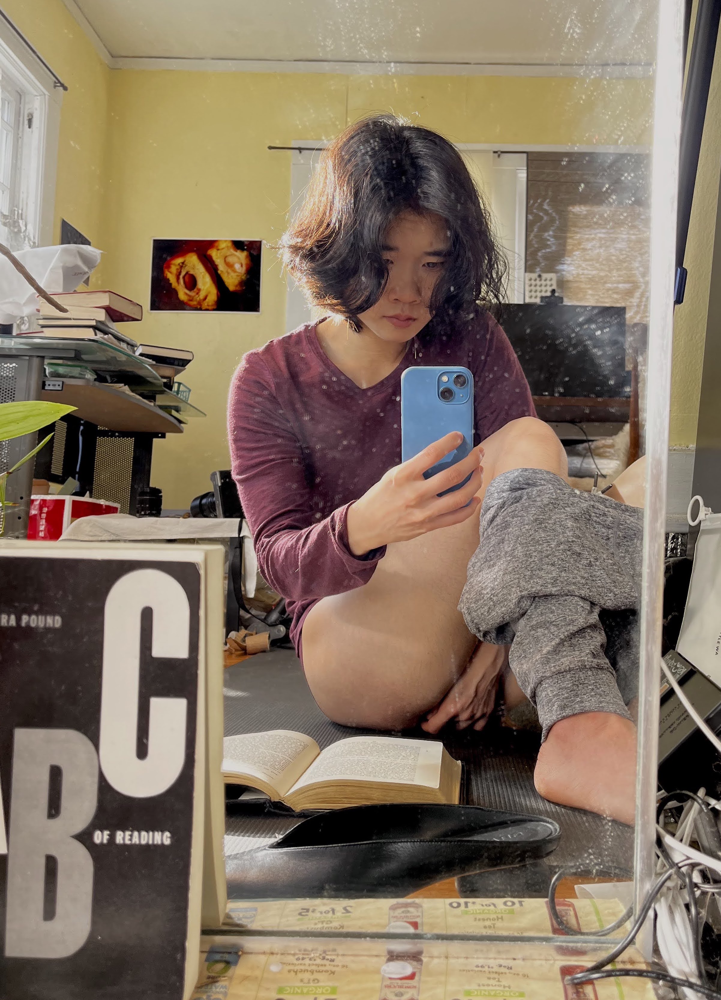 i sobbed in one brief motion as i unlocked the door, and then quickly shifted into a frantic reset: putting away the sheepskins and blankets and yoga mat left in the living room, laundering the blood-stained towel, washing dishes, pulling up readings for class. when i first dared to look in the mirror I saw that my right cheek was pink, and I thought it was so cute—it must have been from being fucked with the one cheek against a pillow. then i saw john as he was walking to class, and we talked a bit. after class he asked me what I had been so occupied with that had prevented me from doing the readings—and I told him that “someone I had met last summer was in town,” and that “i hadn’t even been in my own house,” and he immediately understood, and asked me if it was the one that lives in a van, and I said no, it was the one who came to mourn the death of his friend, the one I hadn’t liked. it was funny to me that i had been made to admit that i had been fucking before class; i’m always worried by my habit of sharing details about my sexual encounters with john, since he had in fact been overwhelmed when i told him about the men i had met in the wake of detransition last september, and because i had told him about having sex with zane in january, which itself seemed to be a dangerous repetition of the past confessional. but this time it felt nice to refer to the undescribed.